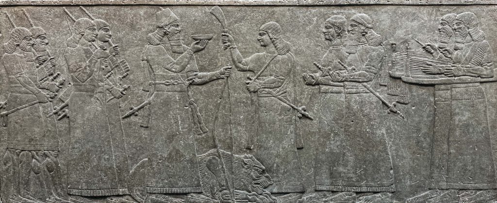 The scene is enriched by two musicians playing horizontal harps, their music likely adding an atmosphere of solemnity and reverence. The melodies may have echoed both the triumph of the hunt and the sanctity of the ritual, celebrating the king’s divine right to rule. Intricate cuneiform inscriptions accompany the scene, reinforcing the ceremonial importance of the hunt and its aftermath—not merely as a record of events, but as a testament to the deeper spiritual and political significance of these acts.