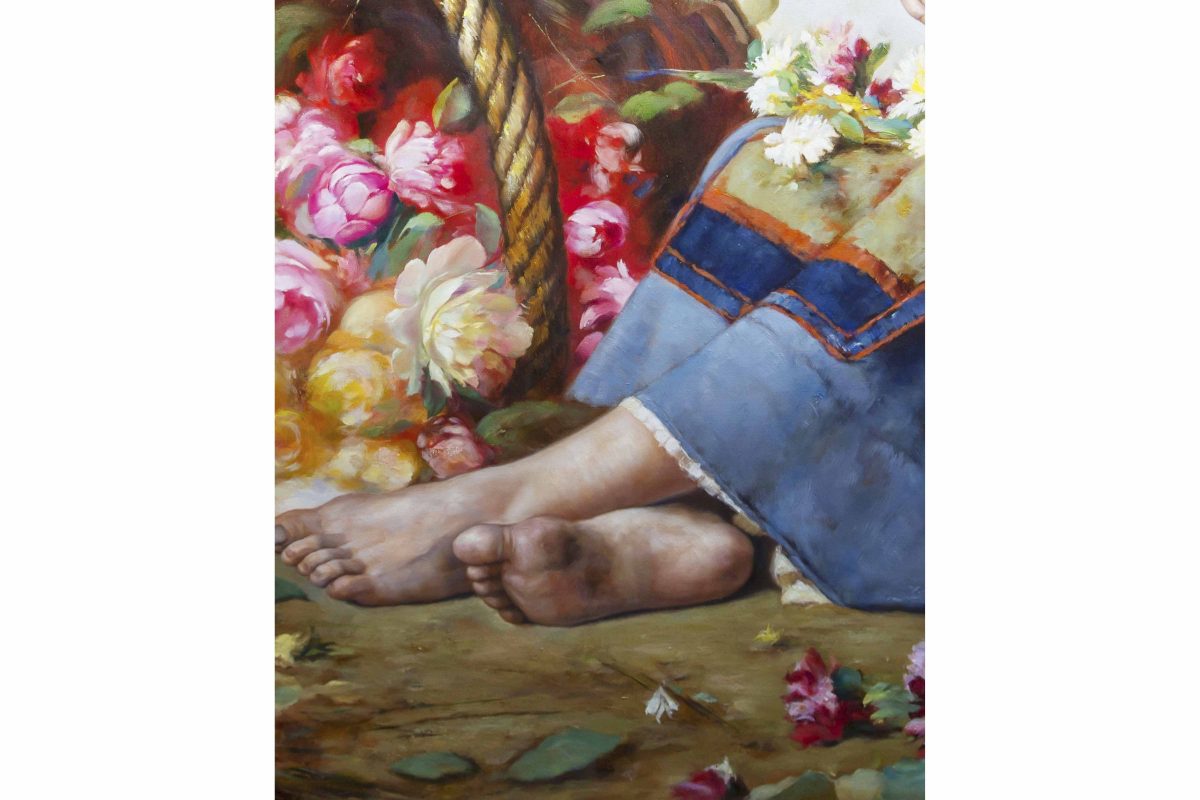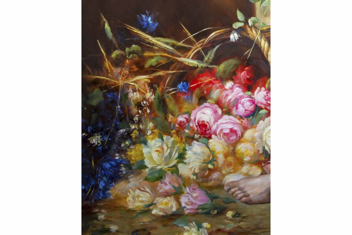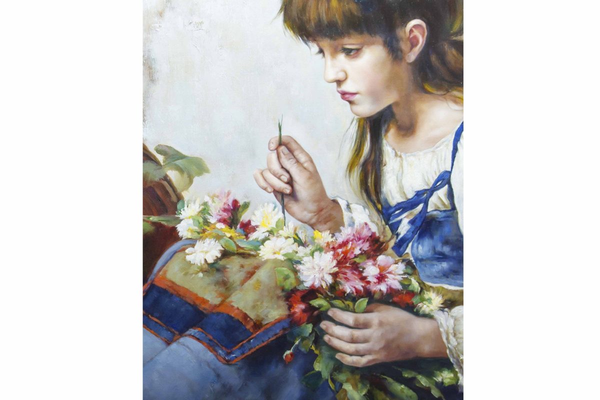 In “Girl with Flowers,” Harlamoff masterfully captures the essence of youth and beauty through the portrayal of a young girl holding a bouquet of flowers. The delicate brushstrokes and attention to detail, especially in the girl’s face and the textures of the flowers, create a soft, enchanting atmosphere. The gentle light illuminating her face further emphasizes the purity and innocence that are characteristic of Harlamoff’s work.