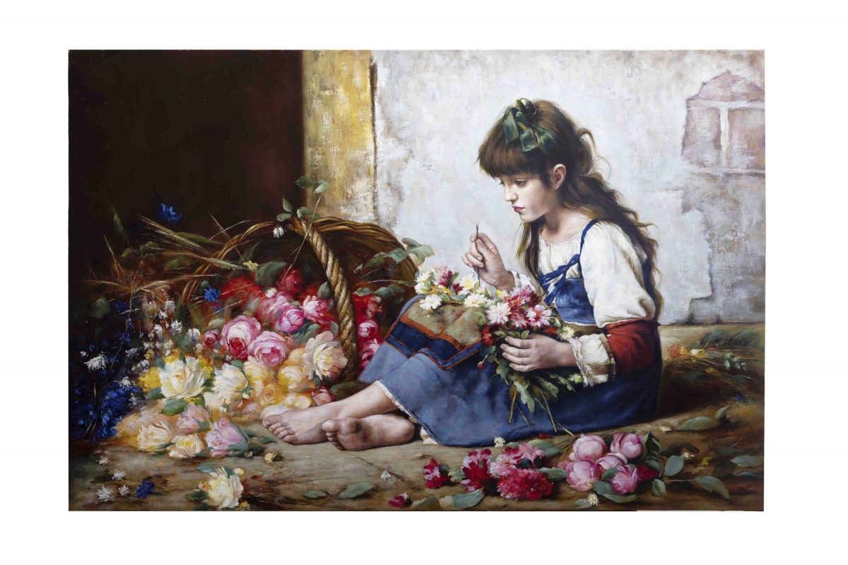 “Girl with Flowers” is a captivating painting by Alexei Alexeievich Harlamoff, who was celebrated for his portraits and genre scenes depicting children and young women. His work seamlessly blended academic training with the influence of the French Impressionist movement, resulting in compositions filled with warmth, tenderness, and innocence.