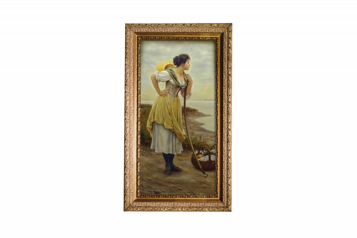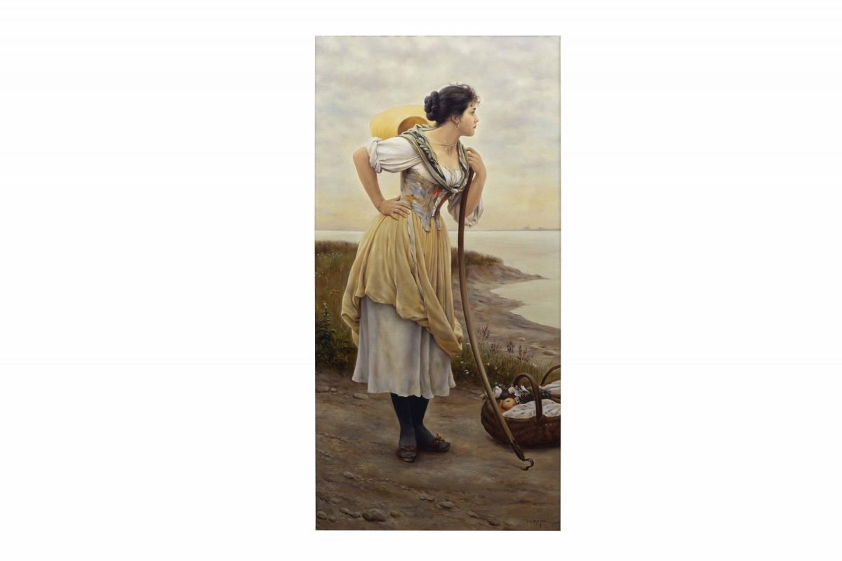 “Awaiting the Return” depicts a young Venetian woman, dressed in traditional attire, as she stands by a canal, anxiously awaiting the arrival of a loved one. The richly embroidered shawl and hat she wears, along with her expressive gaze, convey a palpable sense of anticipation and apprehension.