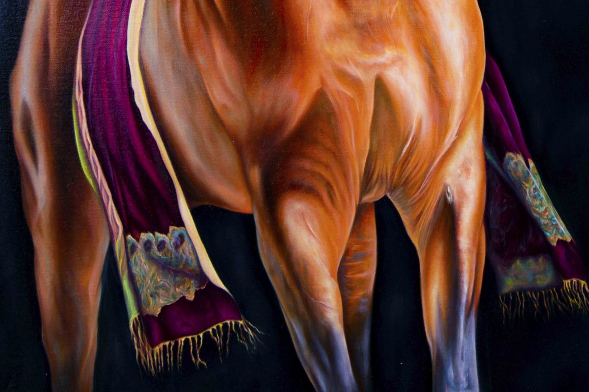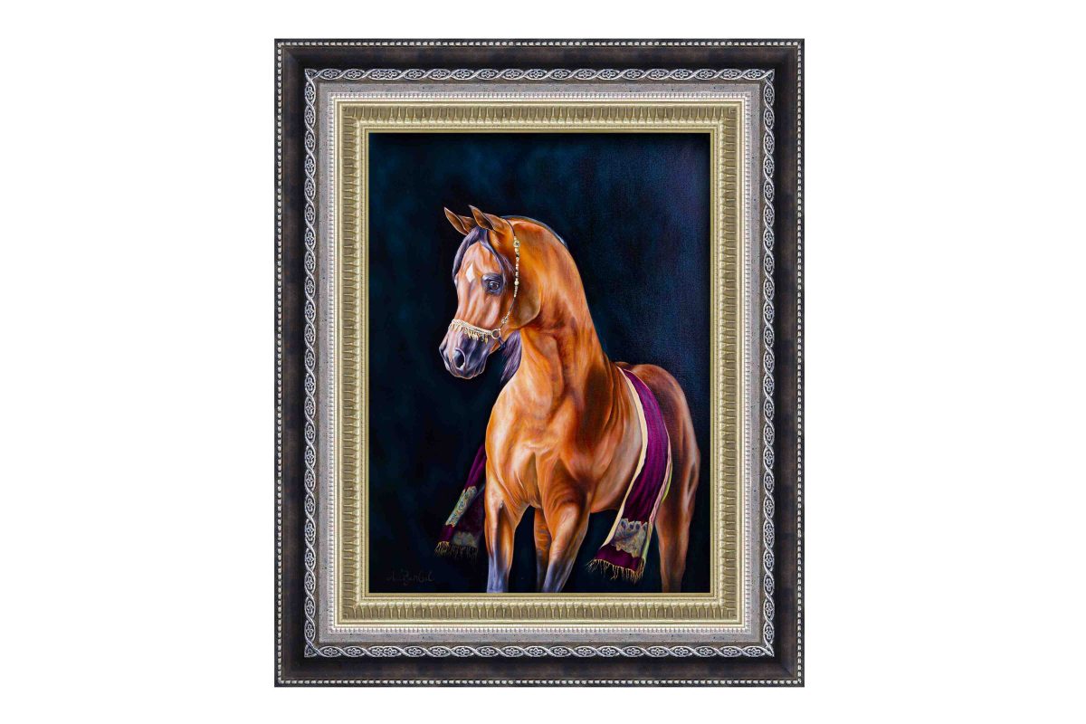 Introducing our captivating Arabian shawl horse oil Painting, a unique piece of equine art that infuses your space with an oriental charm. This vertically oil-painted artwork masterfully captures the grace of a brown steed, adorned with an iconic Arabian shawl, set against a dark, atmospheric background. The vibrant colours and intricate details create a visually stunning statement piece that is both eye-catching and evocative.