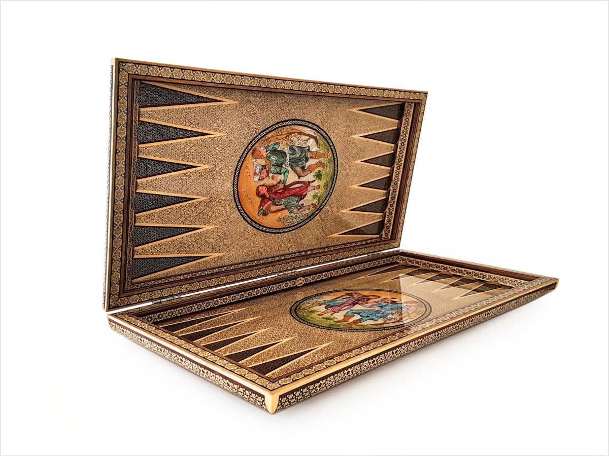 Step into the majestic world of Persian artistry with this intricately designed backgammon or Takhte Nard (Persian: تخته نرد), a testament to Iran’s deep-rooted tradition and craftsmanship. Every detail of this hand-crafted piece hails from the artistic heart of Isfahan, a city renowned for its brilliant artisans and storied history.