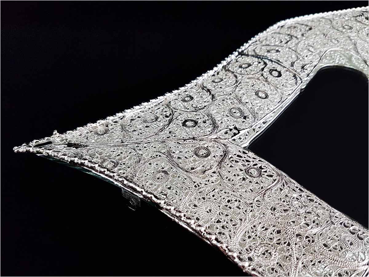 Its frame, a shimmering dance of silver-coated copper, is a masterpiece of the Persian filigree technique or Malileh Kari (Persian: ملیله کاری), gleaming with a brilliance that recalls the first rays of dawn. Each swirl, twirl, and intricate pattern weaves a narrative, celebrating the hands that breathe life into metal, transforming it into art.
