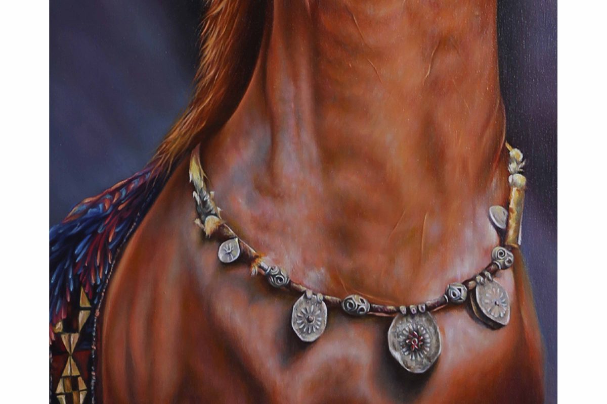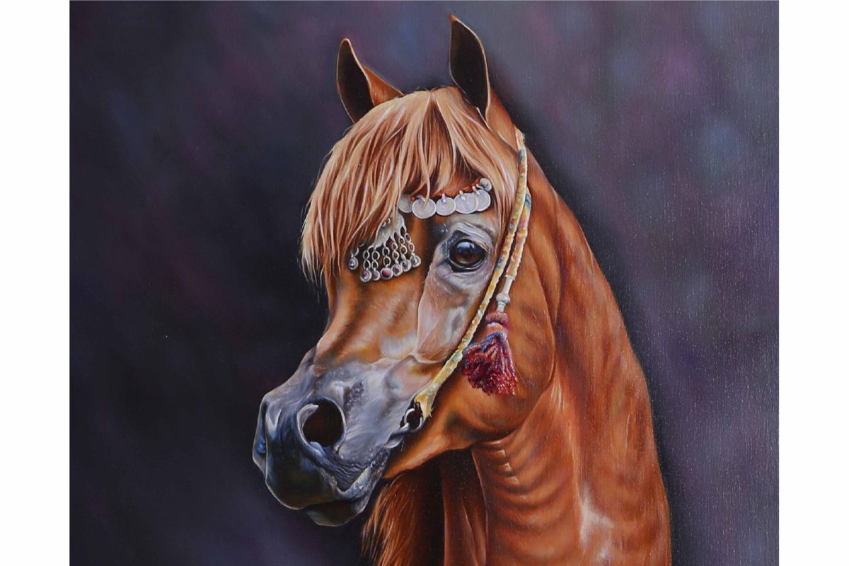 Introducing our mesmerising Persian nomad horse oil painting, a captivating piece of equine art that will elevate any space with its sheer beauty and elegance. This vertical oil-painted artwork showcases a light brown horse adorned with an iconic Persian nomad noseband set against a rich dark purple background. The masterful use of colours and intricate details creates an eye-catching and cherishable statement piece that will leave a lasting impression.