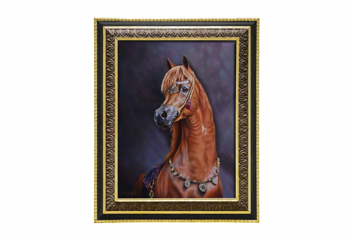 Ideally sized to serve as a stunning centrepiece for your entrance console or to breathe life into drab walls, this oil painting brings a touch of cultural heritage and equine grace into your home. The vivid dark purple background and the iconic noseband make this piece a versatile addition to any interior design style, whether traditional, contemporary, or eclectic.