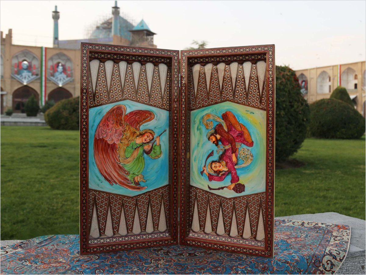 Enter a world of enchantment with this exquisite handcrafted Persian wooden backgammon, made with traditional marquetry techniques in the city of Isfahan. This piece is not just a game, but a true masterpiece.