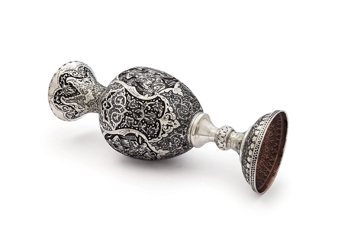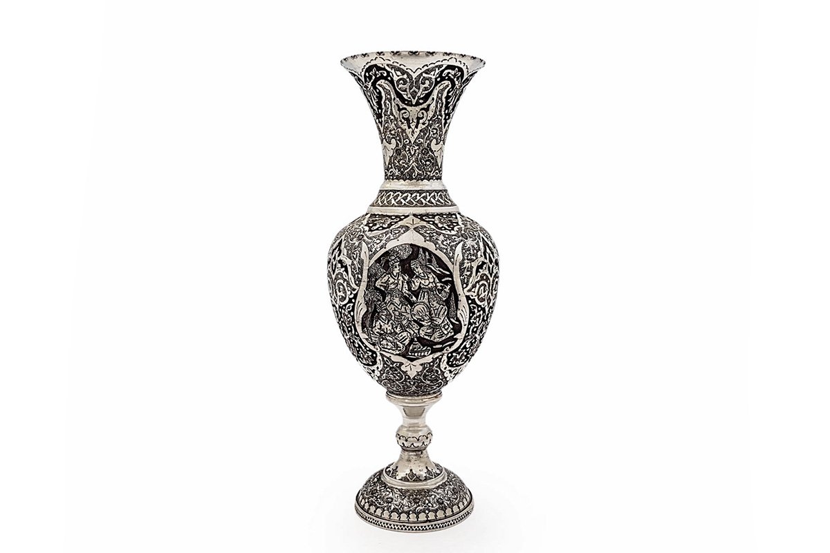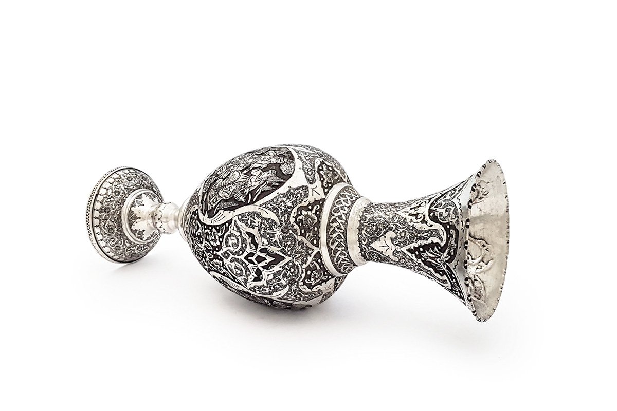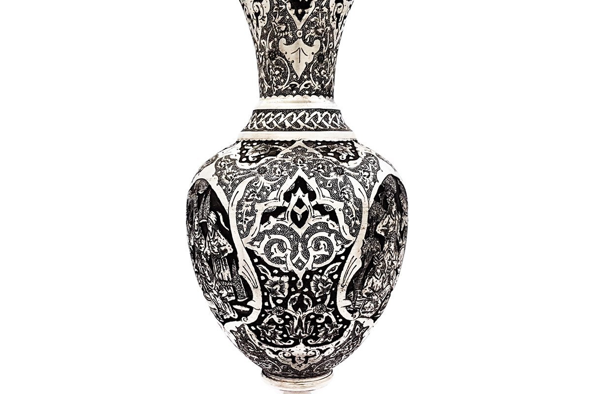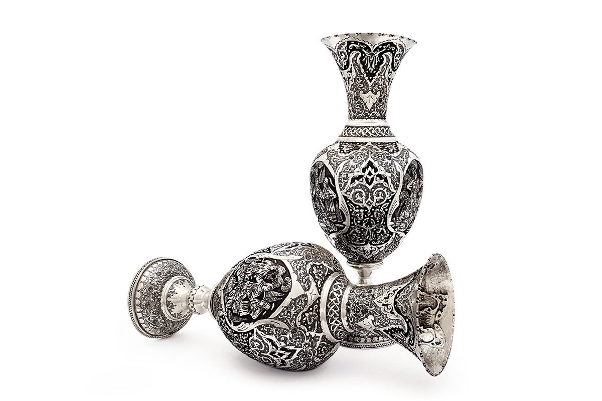 The contrasting harmony of the shimmering silver and the enigmatic black give the vases a distinct appearance, resulting in an exquisite pair of decorative items that not only add an element of grandeur to your space but also narrate a rich story of Persian heritage and artistry.