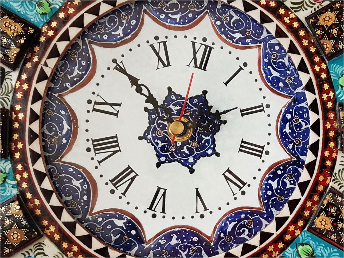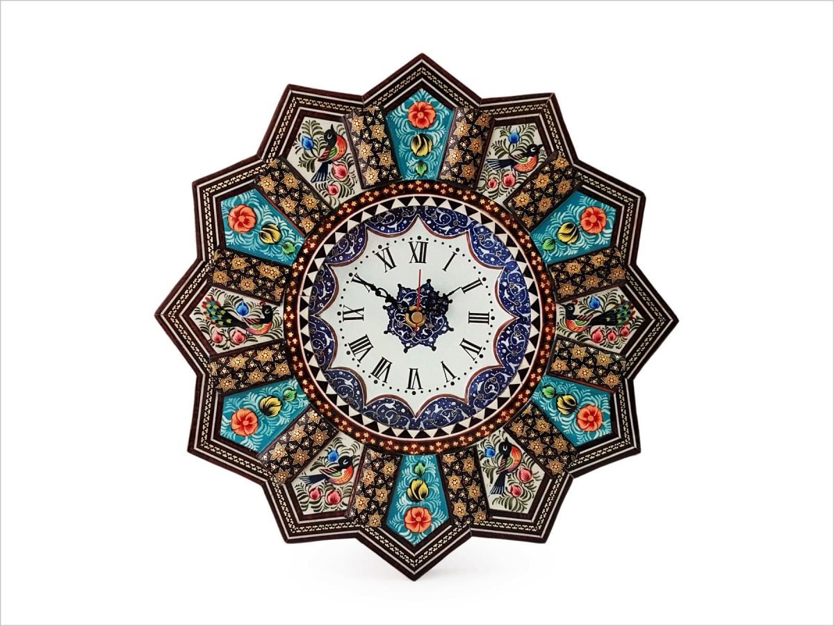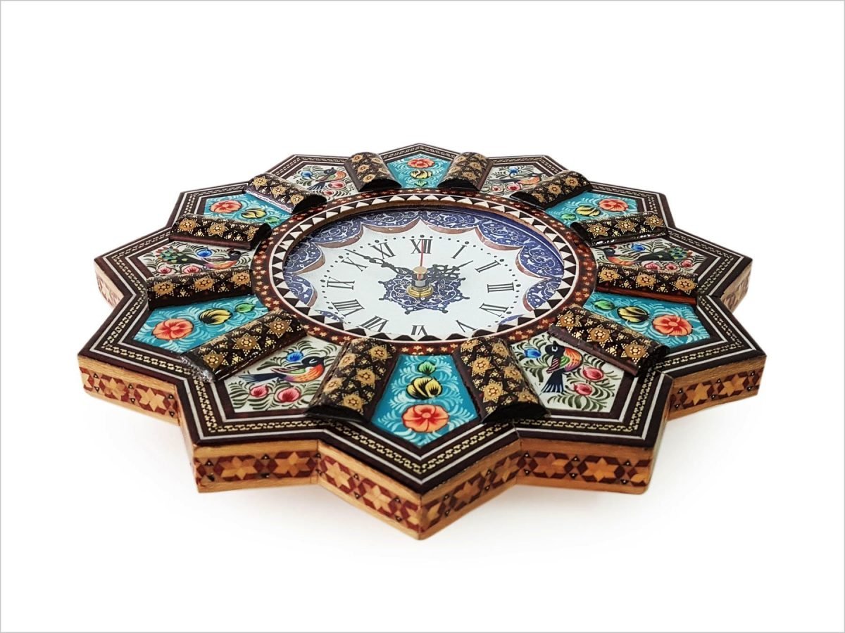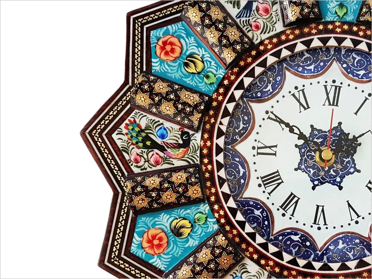 Our wall clock, with a width of 6.3 inches on its enamelled surface, and 12.2 inches across its body, stands as a testament to the elegance of Persian craftsmanship. The enamelled surface, crafted from copper, reflects the artistry of Isfahan, while the body of the clock is a symphony of materials – wood, camel’s bone, and brass, each telling its own tale. With a depth of 6.3 inches on its enamelled facade and 12.2 inches for its body, and weighing a mere 2 pounds, this piece exudes a delicate charm.