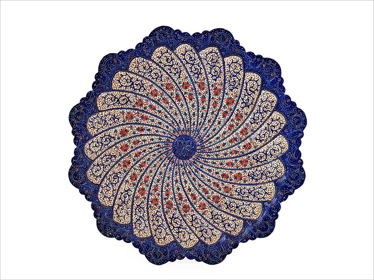 Winding through this magnificent plate is the emblematic arabesque and Islimi motifs, masterfully arranged into an intricate spiral pattern that draws your gaze into its mesmerizing core. Every nook and corner of this pattern is adorned with the luxurious charm of floral and foliate designs, each a tribute to the enchanting landscapes of Persian gardens.
