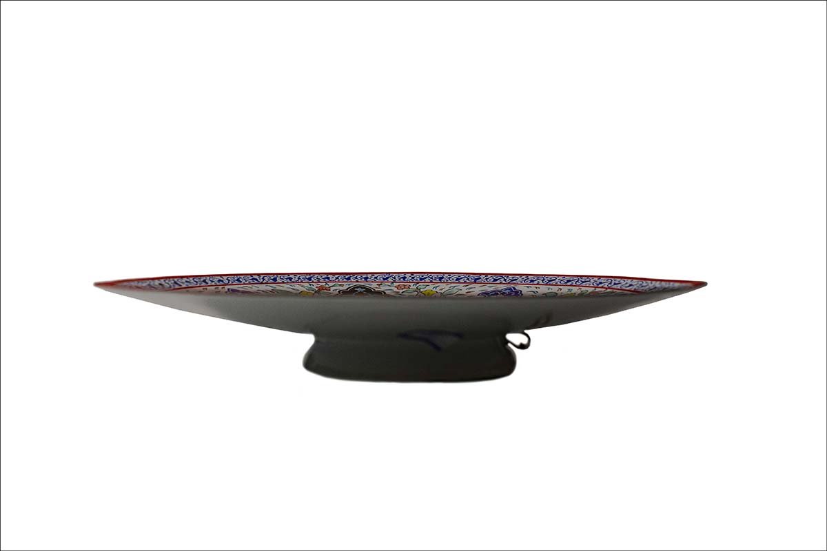 The plate’s surface is brought to life with the intricate rendering of iconic Persian floral and foliate motifs. This rich detailing draws its inspiration from the lush beauty of Persian gardens, encapsulating a paradise replete with nature’s grandeur and the ceaseless dance of life.