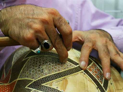 Khātam (Persian: خاتم‎) is an ancient Persian technique of inlaying. It is a version of marquetry where art forms are made by decorating the surface of wooden articles with delicate pieces of wood, bone and metal precisely-cut intricate geometric patterns. Khatam-Kari (Persian: خاتم ‌کاری‎) or Khatam-Bandi (Persian: خاتم‌ بندی‎) refers to the art of crafting a Khatam. Common materials used in the construction of inlaid articles are gold, silver, brass, aluminium and twisted wire.