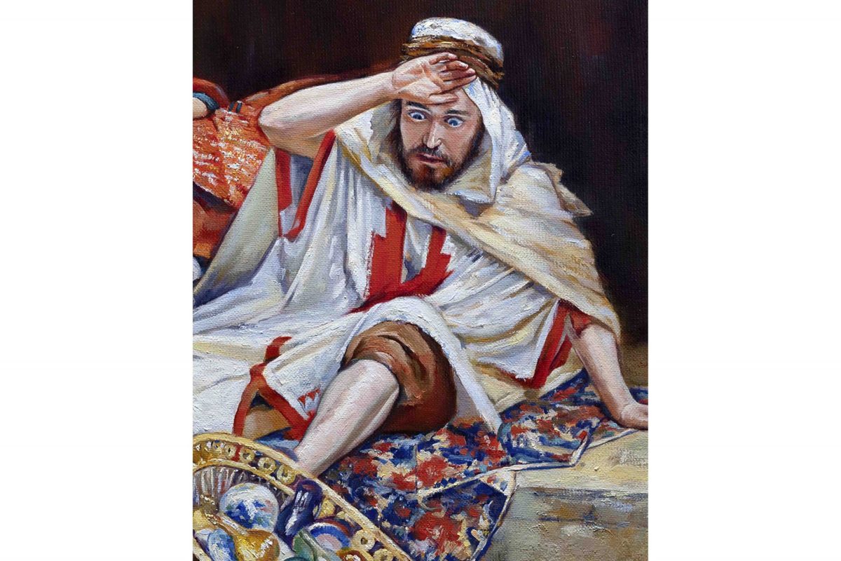 Our masterful reproduction captures the essence of Lockhart’s original painting, blending the reality of Alnaschar’s humble existence with the vivid fantasies of his imagined future. The artwork features the character surrounded by glassware, likely juxtaposing his modest surroundings with dream-like elements of opulence and material possessions.