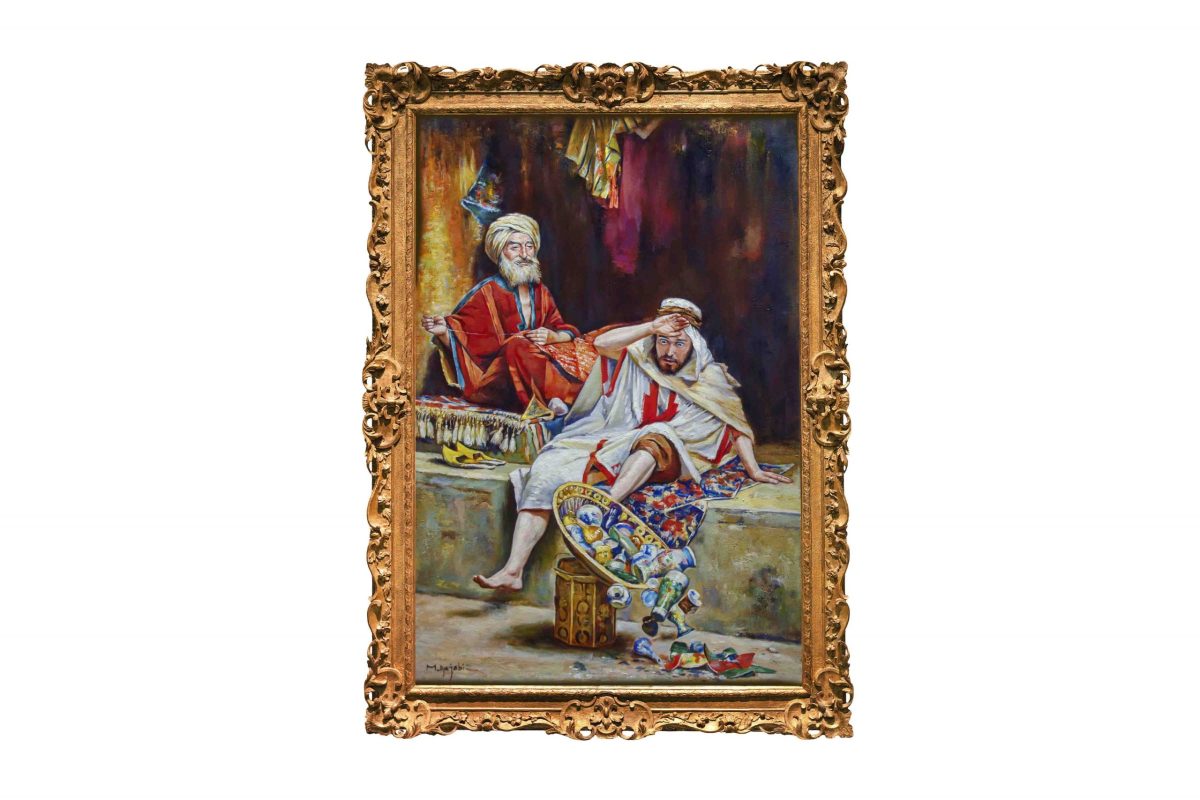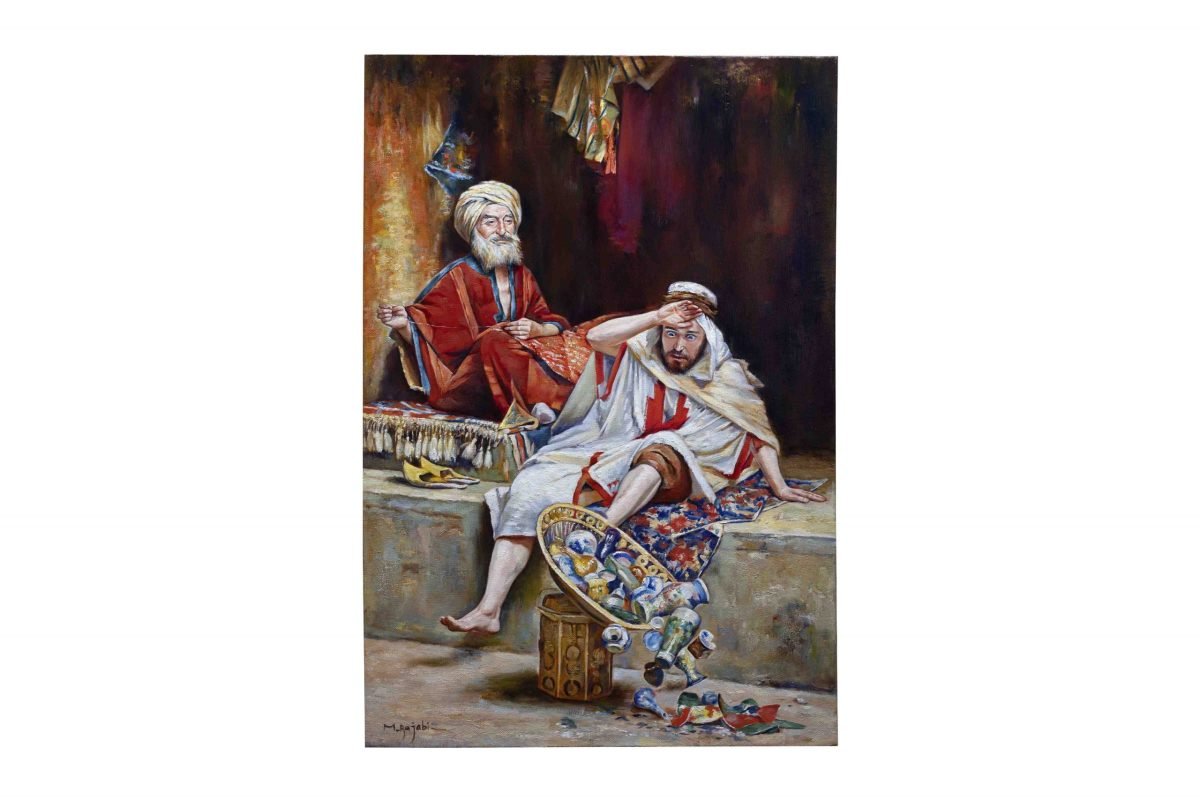 Embark on a journey into the world of Middle Eastern folk tales with our stunning, high-quality replica of William Ewart Lockhart’s “Alnaschar’s Fortune, Arabian Nights.” This captivating painting brings to life a lesser-known story from the legendary “One Thousand and One Nights” collection, showcasing the dreams of Alnaschar, a poor glassware salesman yearning for wealth and a better life.