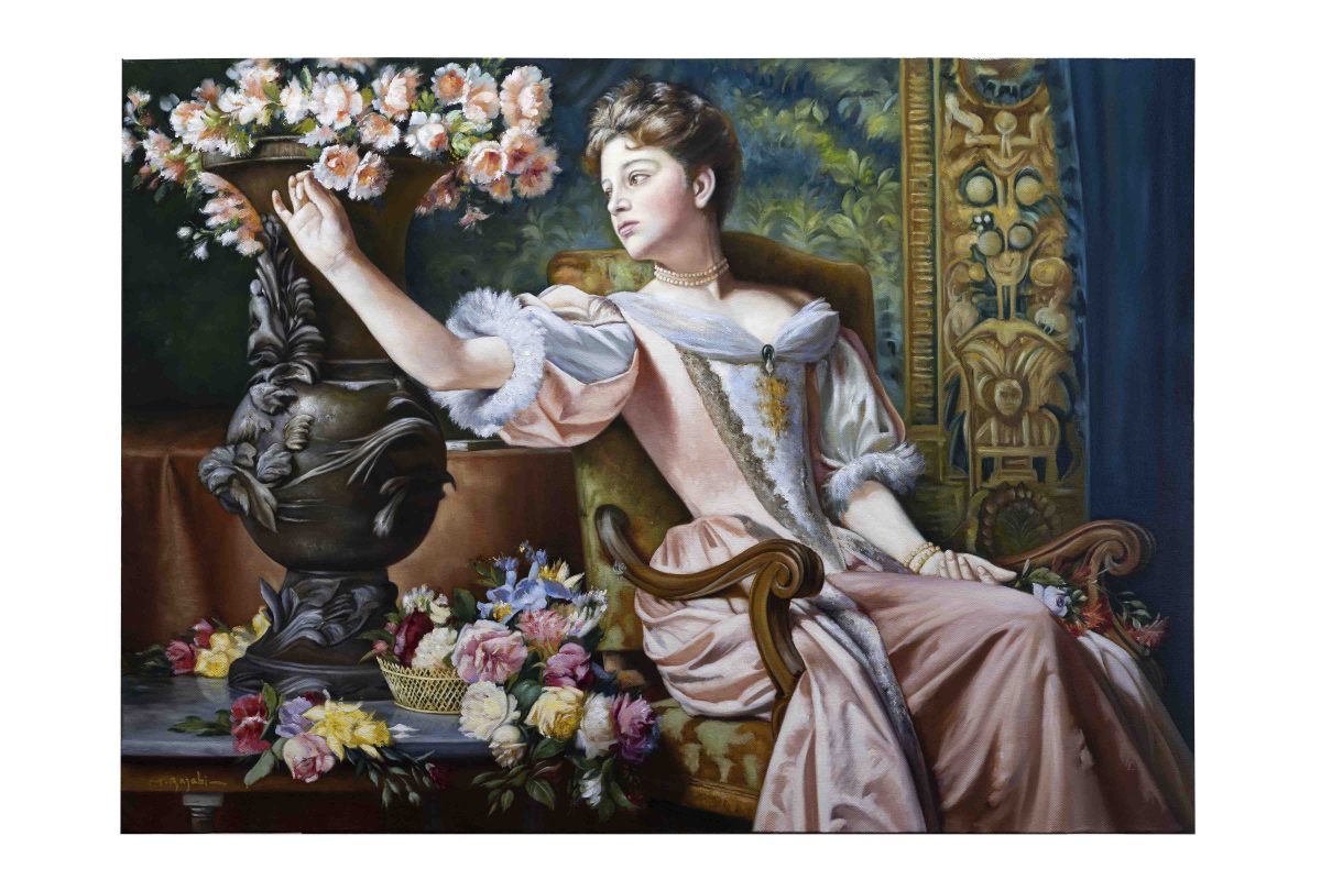 The Neoclassical style of the painting is characterized by its classical subject matter and idealized forms, reflecting a return to the aesthetics of ancient Greece and Rome. The artist’s masterful use of colour and light creates an atmosphere of refined elegance, with the soft glow of sunlight illuminating the woman’s face and the vibrant hues of the flowers. The attention to detail in the woman’s features, clothing, and the surrounding elements showcases the artist’s exceptional skill and craftsmanship.