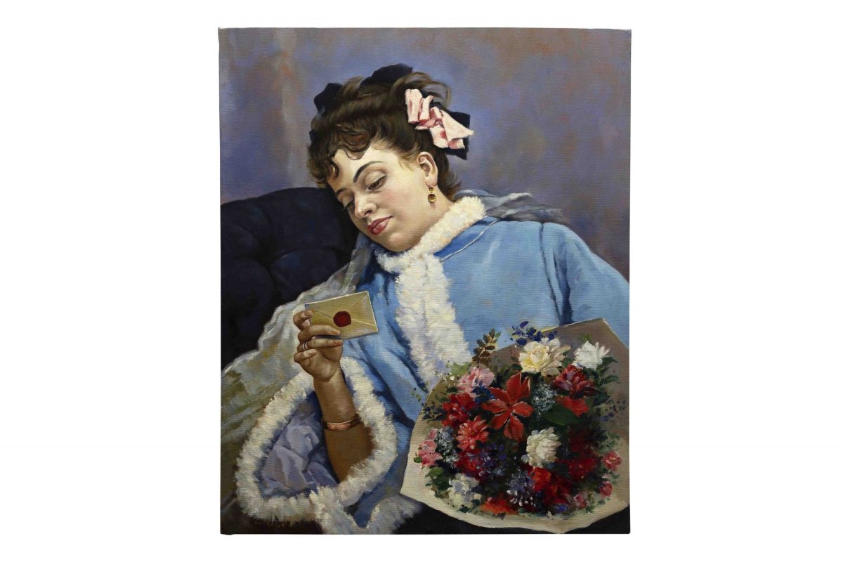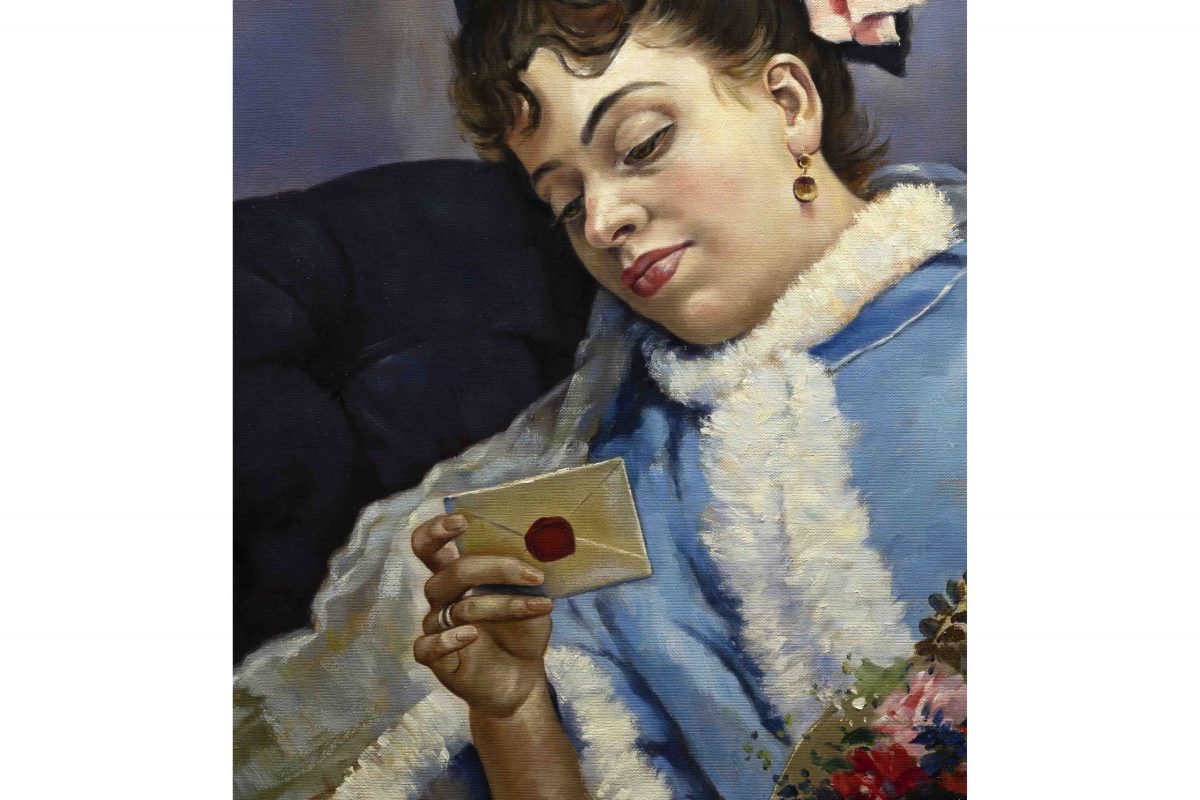 In terms of composition, our replica faithfully follows Madrazo’s intimate, close-up view. The woman, occupying the majority of the canvas, fills the space with her presence. Her off-centre placement and angled positioning guide the viewer’s eye towards the love letter—the narrative’s heart.