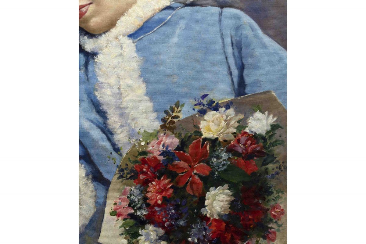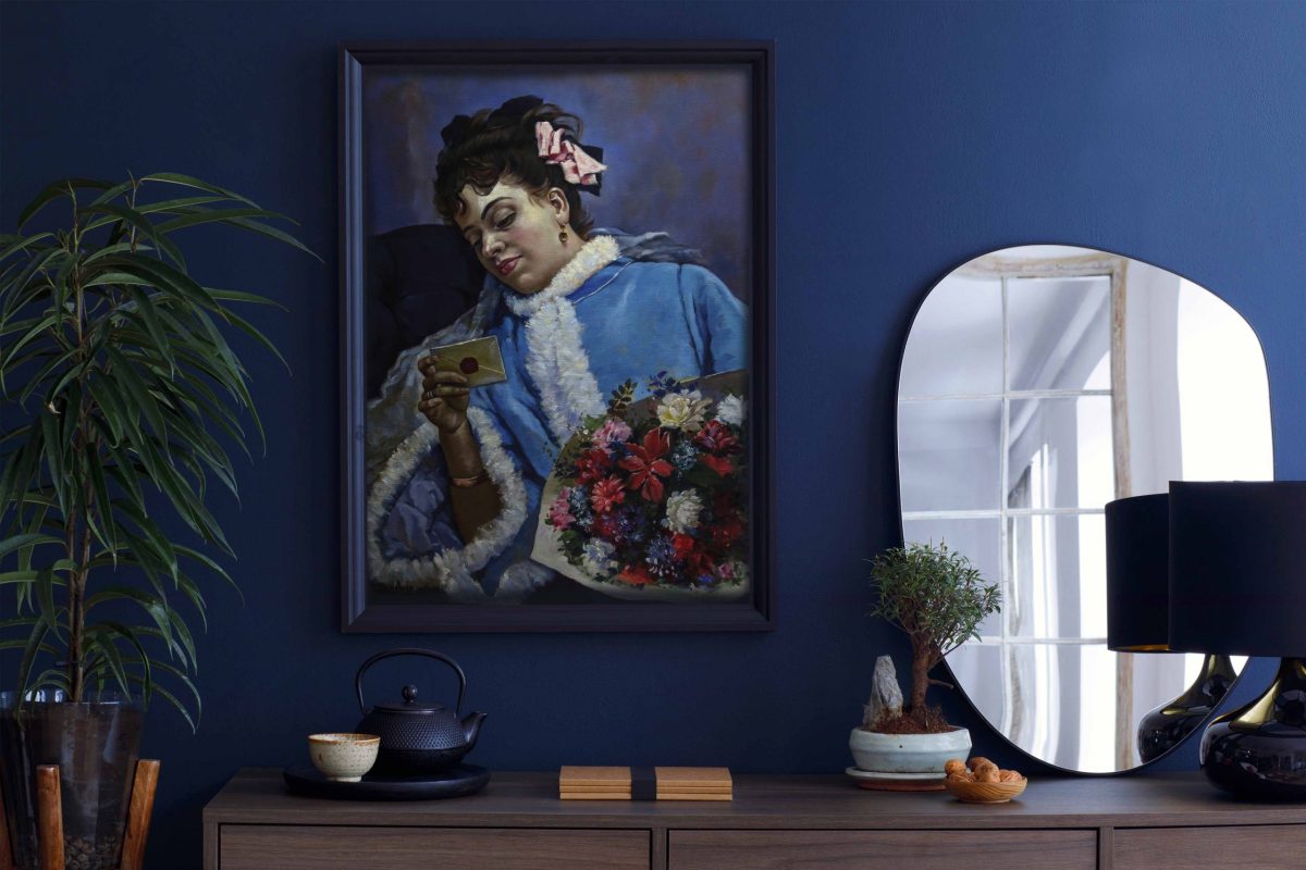 The colour palette in our “Felicitación De Cumpleaños” replica is just as captivating as in the original. Dominated by the soothing blue of the woman’s winter coat and the delicate white of the feathers on the collar, the painting exudes a sense of serenity and intimacy. The woman’s coat, a masterpiece of textile rendering, is an eye-catching element, its cool blue tone symbolizing tranquillity and depth of feeling. The bouquet of flowers she has received along with the letter adds a splash of varied hues, adding to the visual appeal. The softer tones of the background further emphasize the subject, demonstrating Madrazo’s skill in compositional balance.